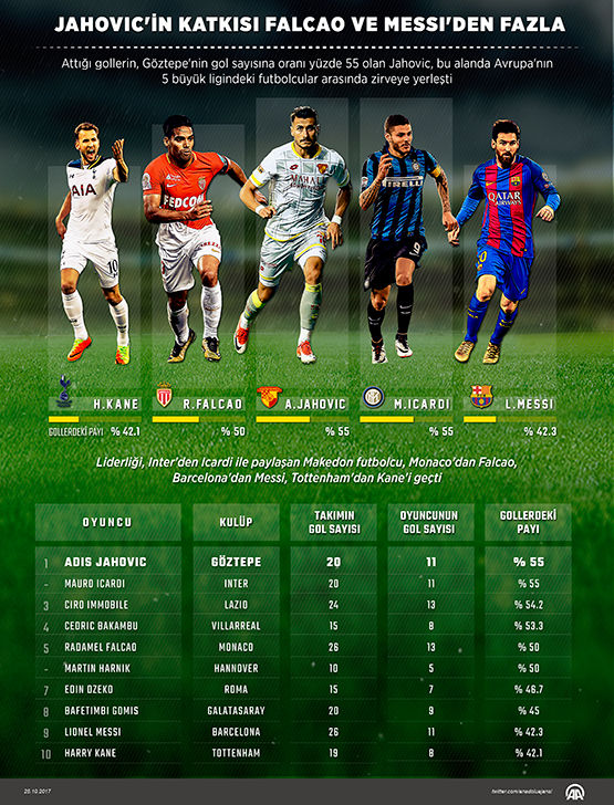 Jahovic, bu değerlendirmeye göre, İngiltere (Premier Lig), İspanya (La Liga), İtalya (Serie A), Almanya (Bundesliga) ve Fransa'nın (Ligue 1) en üst futbol liglerinde, çift haneli skor üreten takımlarda top koşturan futbolcular arasında zirveye yerleşti.