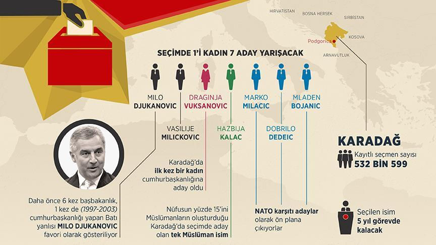 Pazar günü yapılacak seçim öncesinde en yoğun ilgiyi eski başbakanlardan Djukanovic ile Karadağ tarihinin ilk kadın cumhurbaşkanı adayı Vuksanovic görürken, anketler daha önce 25 yıl boyunca iktidarda kalmış ve hem başbakanlık hem de cumhurbaşkanlığı yapmış Djukanovic'i seçimin favorisi olarak gösteriyor.